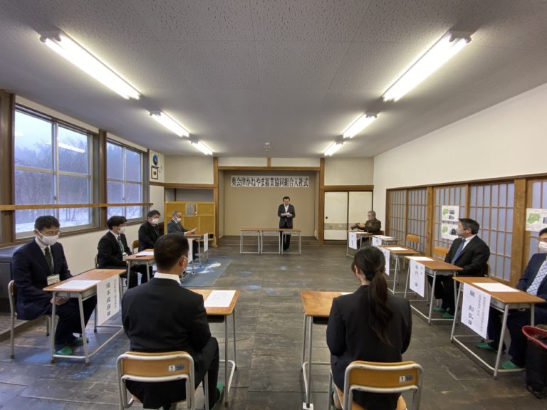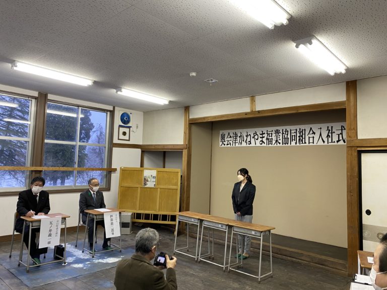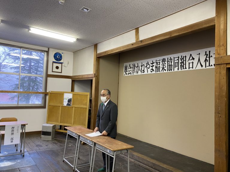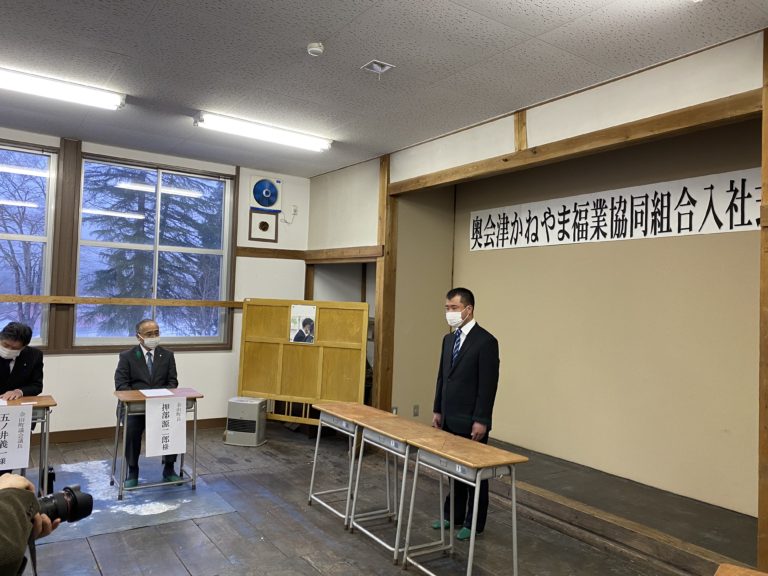 令和4年度の事業計画は派遣職員3名増員の予定で、ハローワーク、Fターンサイト、公式ホームページなどで求人しておりましたが、星賢孝事務局長の知人で“只見線に世界一乗る男”として従来から奥会津に足を運んでおり、今回の就職で福島県郡山市から福島県金山町に移住した大越智貴さん(29)と、金山町『広報かねやま2月号』特集“いろいろな働き方”として就業中の派遣職員や派遣先、組合活動を掲載して頂いた記事をご覧になって応募して下さった金山町在住の栗田みなみさん(33)の2名が4月1日付で入社になりました。就業日の調整もありまして、晴れて4月15日(金)入社式を執り行うことができました。