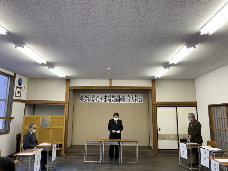 (中央)挨拶を述べる、奥会津かねやま福業協同組合 目黒祐一代表理事